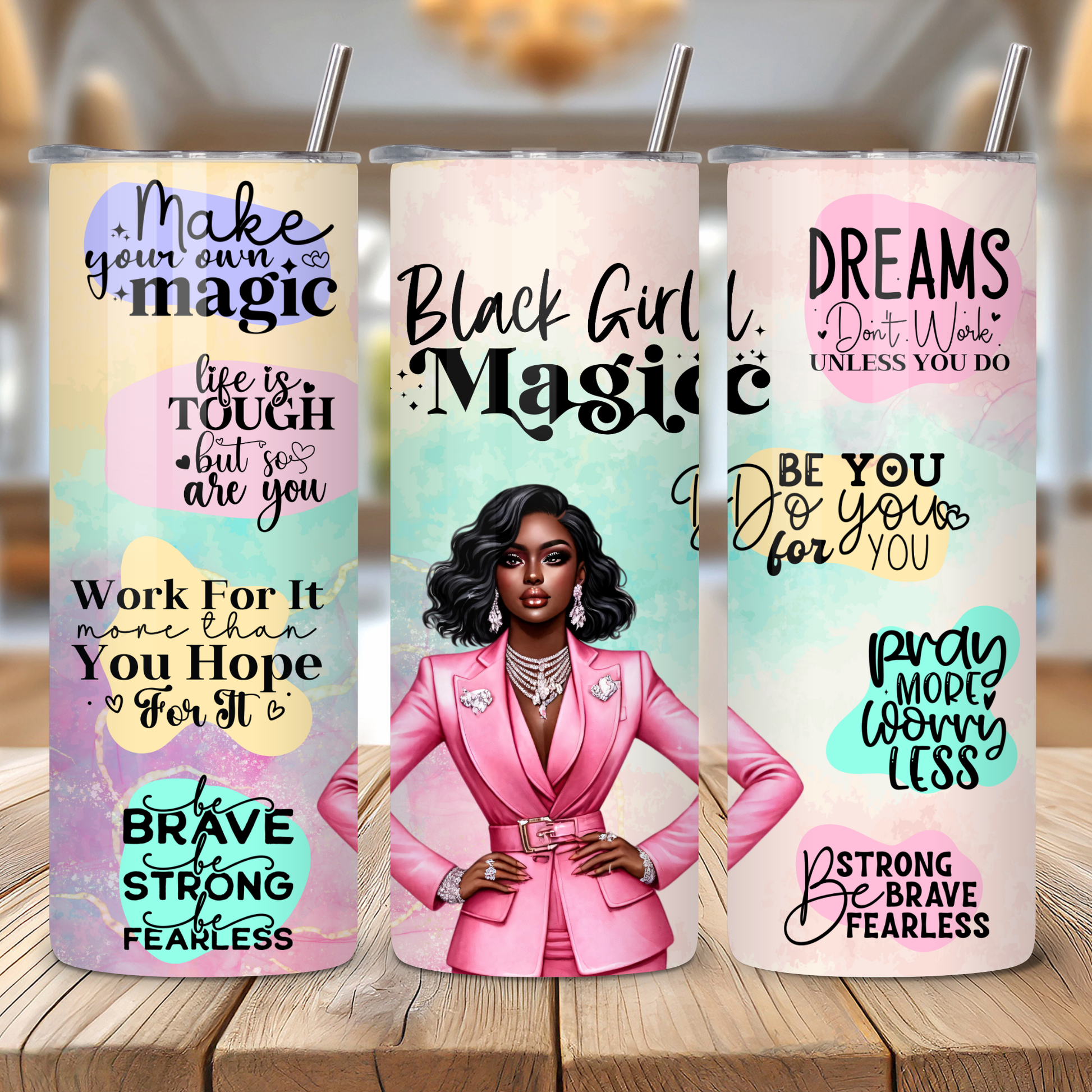 Empower yourself with this uplifting and inspiring tumbler wrap. Featuring a beautiful Black woman holding a glass of wine, surrounded by positive affirmations, this design is perfect for celebrating your strength, beauty, and worth. Download instantly for a unique and personalized motivational tool.