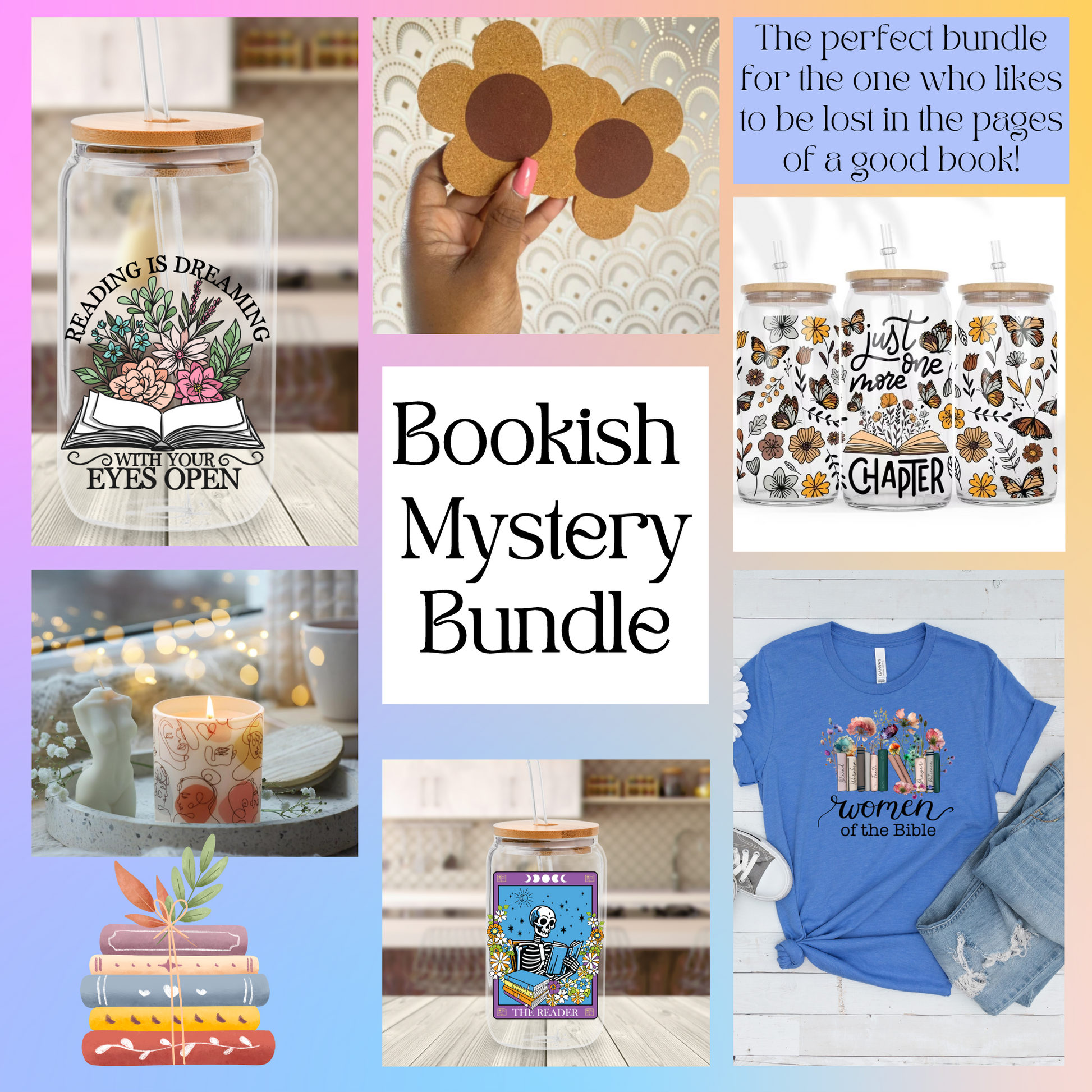 Discover the perfect treat for yourself, or the perfect gift for the book lover in your life with THE $125 MYSTERY BOOKISH BUNDLE! Each bundle contains a curated selection of bookish items, carefully chosen to enhance the reading experience. Indulge in the mystery and surprise of this unique bundle.
